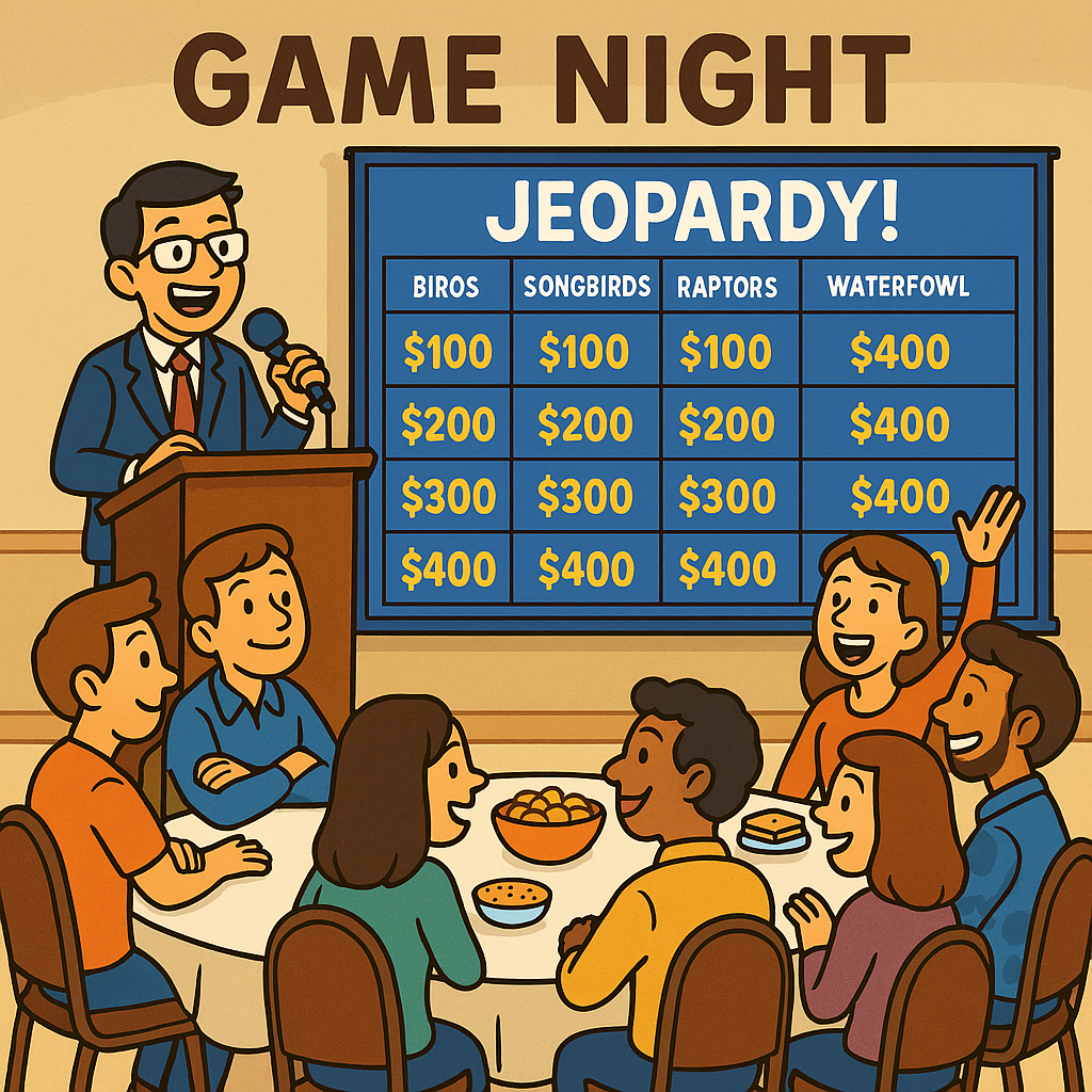 Join us for a game of bird jeopardy. We will have snacks on the tables and prizes for the winners. Each table will be a team. This is a great program built by Steve Waller from a birding group in Michigan’s Upper Peninsula.